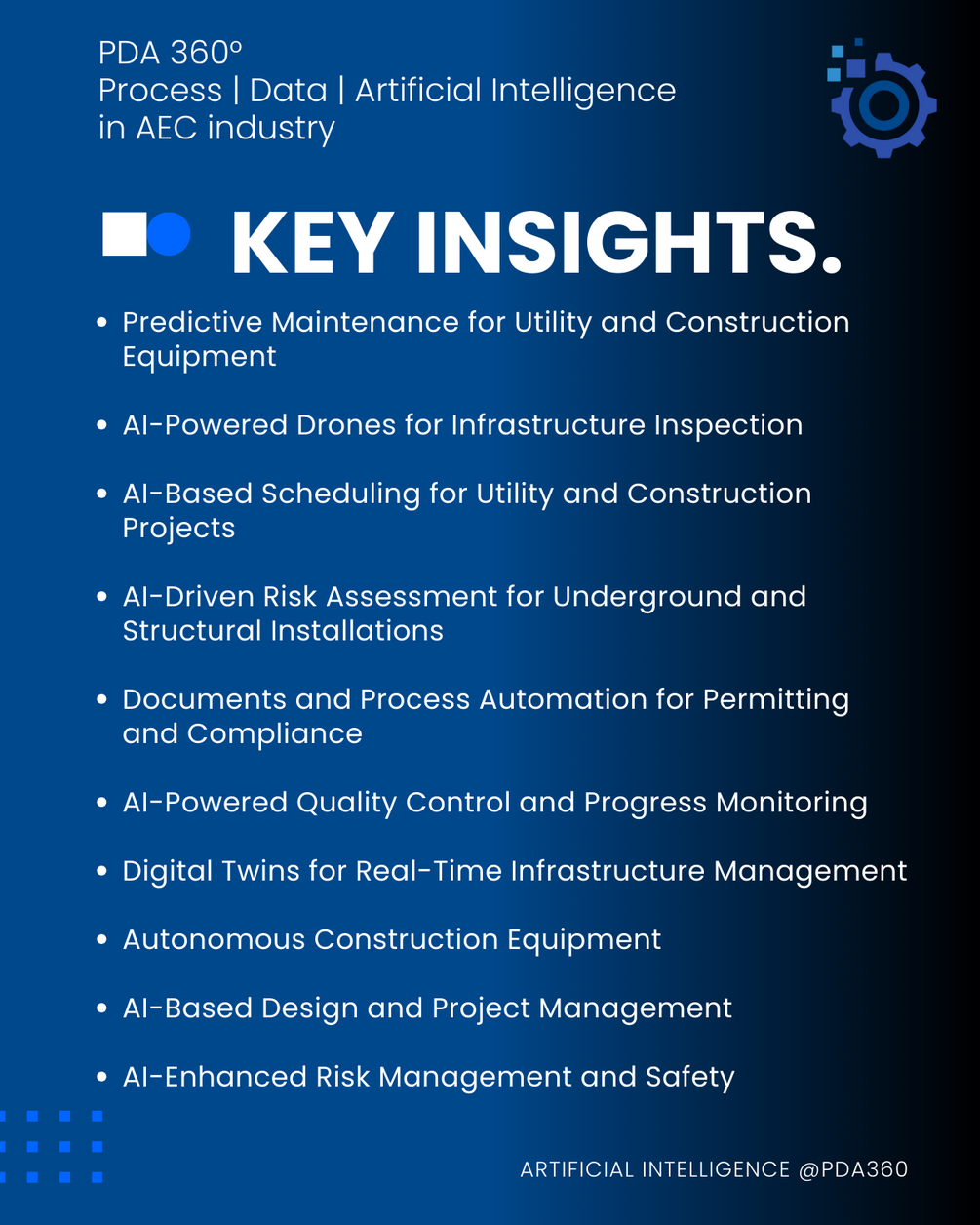 The integration of Artificial Intelligence (AI) in infrastructure construction is rapidly transforming the sector, improving efficiency, automation, risk management, and decision-making. AI-driven technologies are already being implemented across predictive maintenance, drone-based inspections, AI-powered scheduling, risk assessment, permitting automation, quality control, digital twins, and autonomous construction equipment.