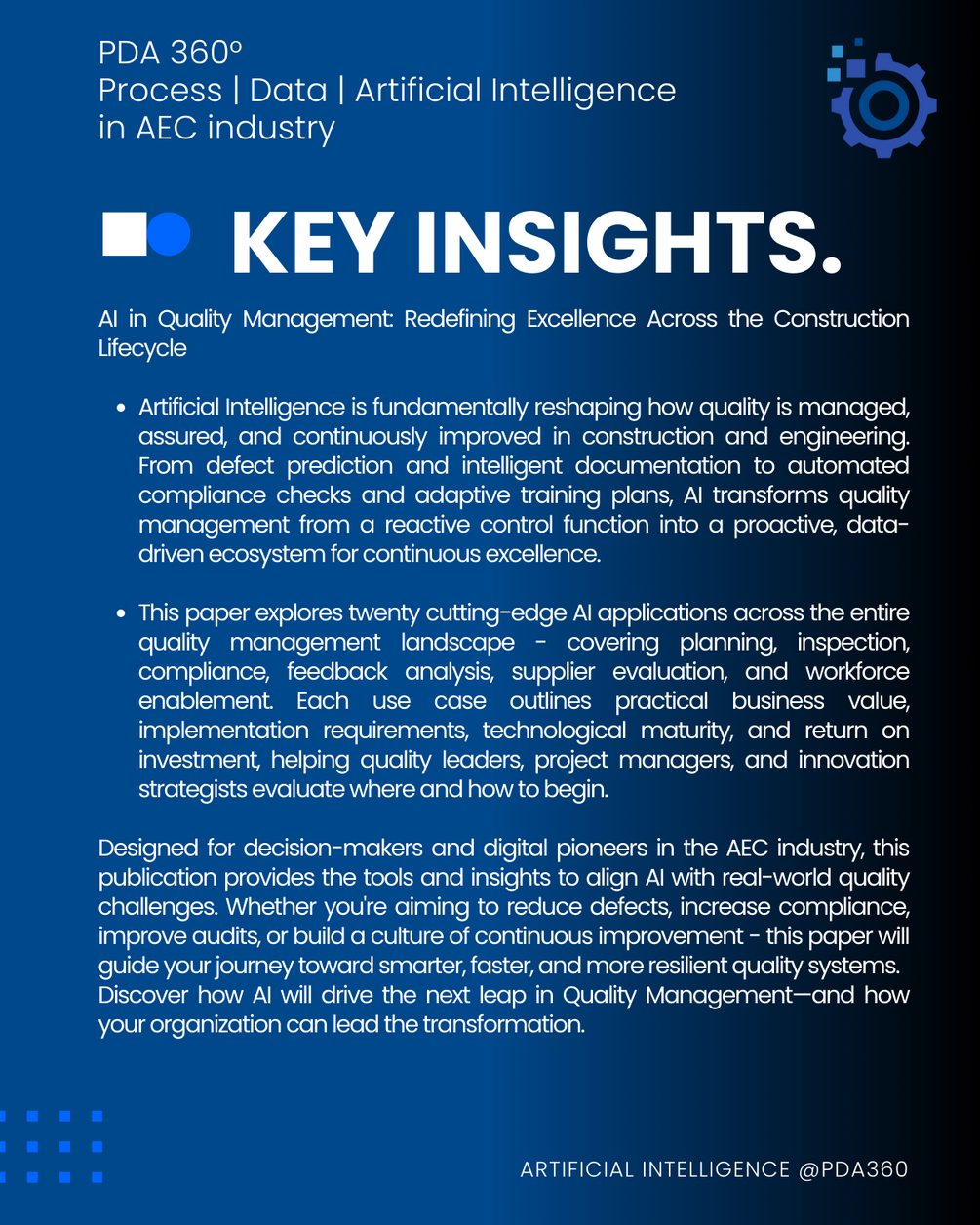 The purpose of this paper is to equip quality managers, project leaders, compliance officers, and innovation strategists with a practical, action-oriented guide to deploying AI in quality management. It aims to raise awareness of real-world use cases, demystify technical requirements, and support structured decision-making around digital quality transformation. By linking AI capabilities with everyday quality challenges, the paper helps AEC organizations shape a future where quality is no longer inspected in but built in by intelligent systems that learn, adapt, and improve continuously.