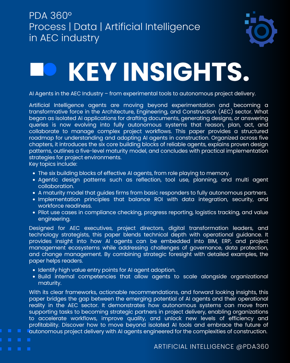 This insight paper presents a comprehensive analysis of the next transformative wave in construction technology: the shift from using standalone AI tools to deploying autonomous AI agents. It argues that AI agents represent a fundamental change, moving beyond simple task automation to managing complex, multi-stage project workflows from start to finish, thereby offering a decisive competitive advantage for early adopters.